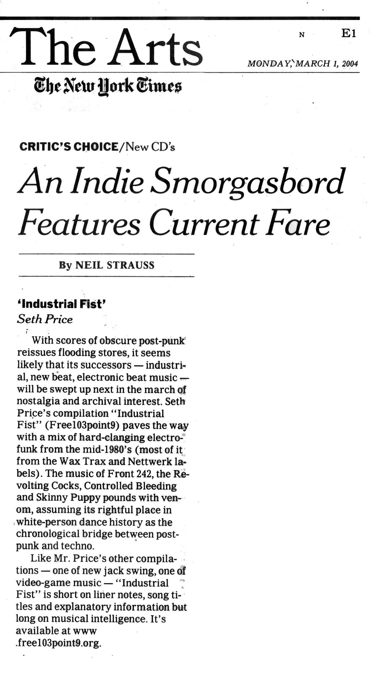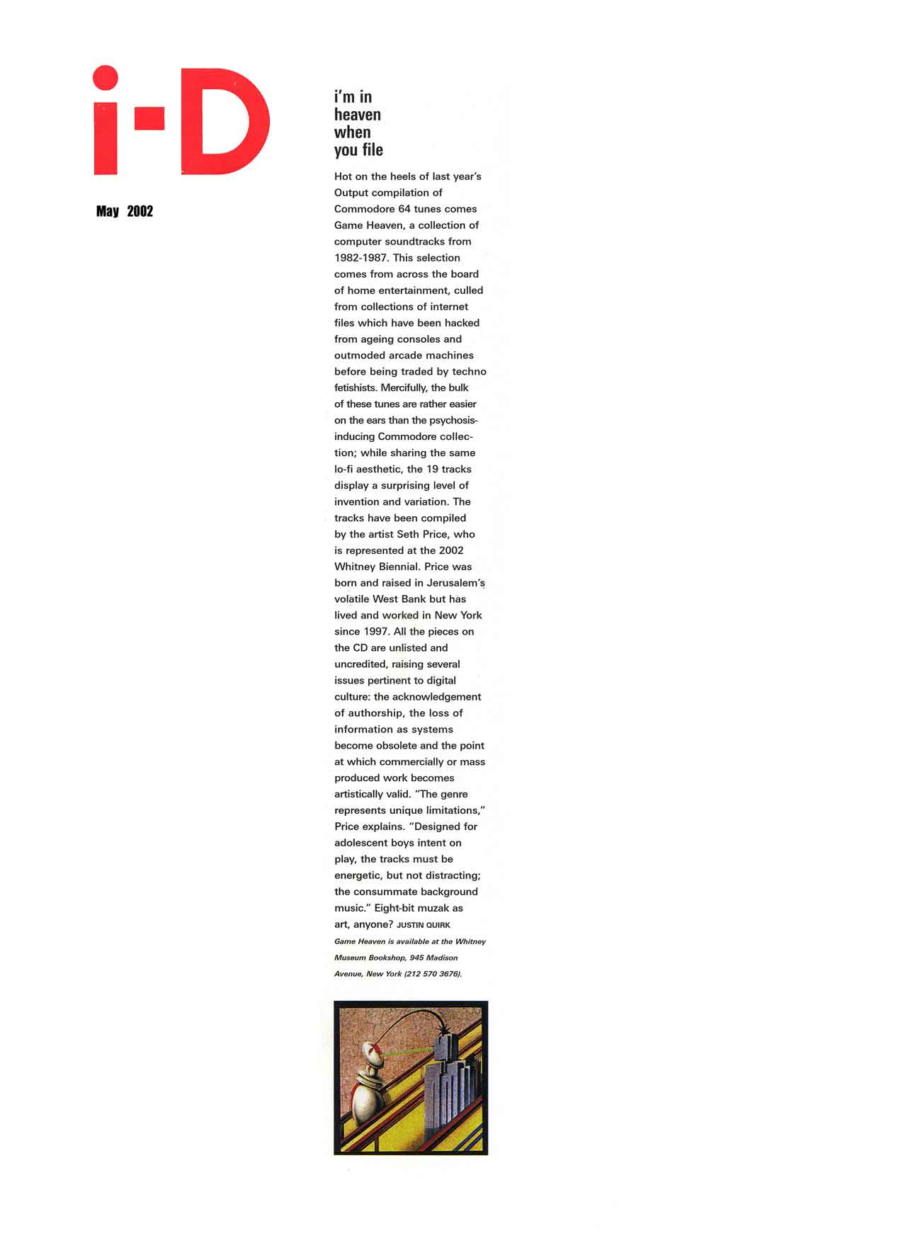 ""An inquiry into the ways that digital technologies have effected music production, both in popular forms as well as in more rarified modern composition, the project examines a brief but tumultuous history that in 30 years has brought us the sampler, MIDI, cheap synthesizers, the compact disc, personal computers, and the World Wide Web. In an ongoing series of music compilations, each concentrating on a technologically transitional but culturally ill-defined moment within this recent history, Price suggests how production tools have changed music, both in distribution and who controls it as much as in structure and sound. These moments so far include the growth of the early video game sound track as a musical form; the "New Jack Swing" era, when pop producers began really tightening their hold on rap and hip hop; the consolidation of experimental Industrial music into beat-oriented dance genres; and the first years of the sampler, when the technology was embodied in machines of such expense that only institutions like university composition labs could afford them. These compilations have each been released in various audio formats and packaging designs, occasionally with changing titles. Some have been available cheaply in bookstores, museum shops, or on the internet, while others have been self-published or produced as limited art editions. As an accompaniment to each, Price has written an essay on the music in question and published it in a magazine. These pieces take rough cues from the music, and range in style from the tersely schematic to the base journalistic to the more abstractly theoretical. As a mass form operating outside commercial channels, the mix tape seems to stubbornly and perversely retain its purchase on the imagination long after actual mix-tapes have slipped free of storage constraints and lost any clear definition. This is evident in recent aggregation phenomena such as "celebrity play lists", consumer my-favorite-genre lists posted to shopping sites, podcasts, or mixes freely available on specialist file-sharing blogs (which themselves often focus on musical moments presented as obscure or lost; these sites must be seen as generously redemptive gestures). The need for such gentle but total recommendation, i.e. a packaging with no form, a package constituted mainly of taste, has always been with us, but seems only to increase with the decline of previously important guideposts like the music video, the niche radio station, and, above all, physical packaging itself." - Distributed History An excerpt from an interview with Price in which he discusses "Title Variable" can be downloaded here: 1. Akademische Graffiti / Unique Source / All Natural Suicide Gang (2005) Was Ist Los (Continuous LP Mix) 2. Industry (2003) Side 1 Side 2 3. Video Game Soundtracks 1983-1987 (2001) 4. NJS/Nieuw Jaczx Swynjge 2003. Essay, written to accompany NJS (download) Purchase later-release CD from free103point9 Seth Price's work has recently been exhibited at the Kunsthalle Zurich, Reena Spaulings Fine Art, and Friedrich Petzel Gallery. His films and videos have been screened internationally at venues including The Swiss Institute, the ICA London, and the Rotterdam Film Festival. He lives in New York. RELATED RESOURCES: |